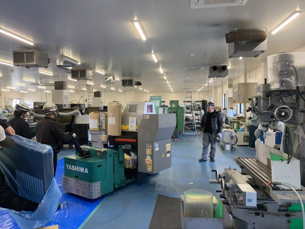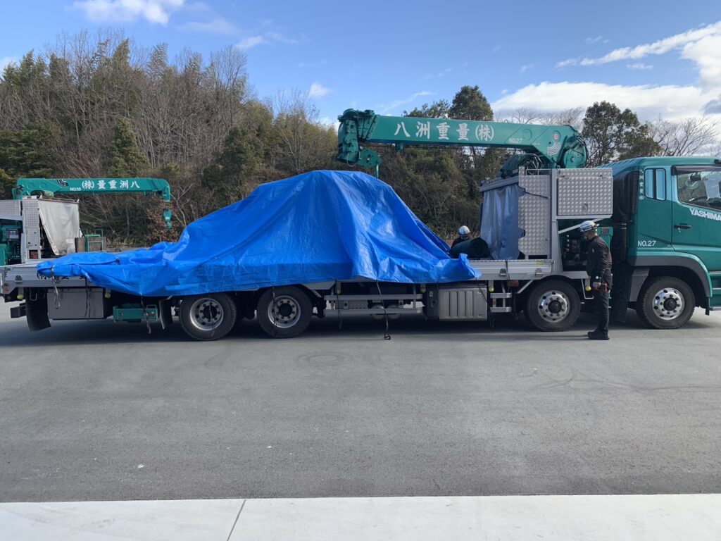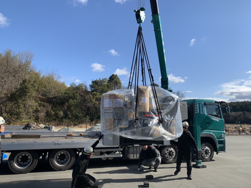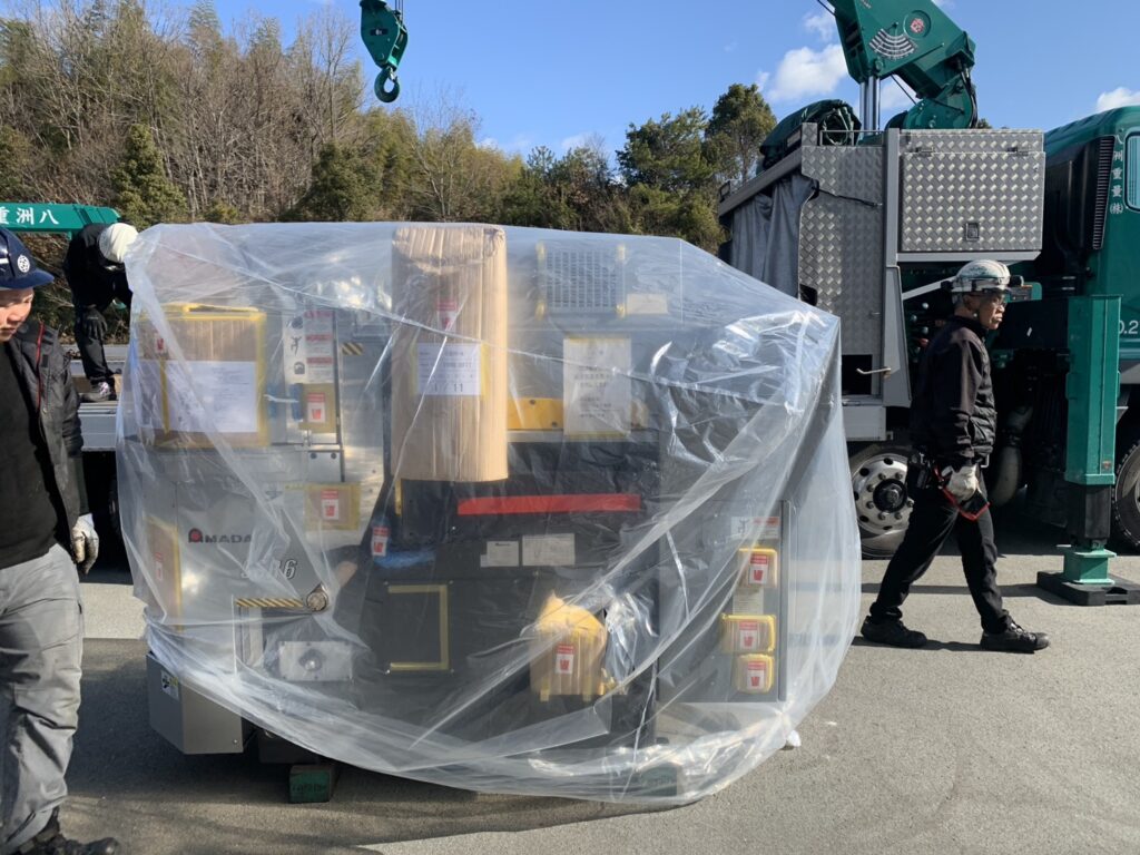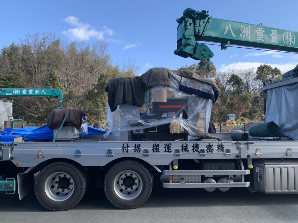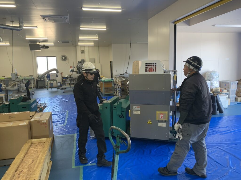 当日は専門業者による搬送作業が行われ、クレーンを使用しての慎重な荷下ろし、工場内への精密な移動・据付作業が進められました。